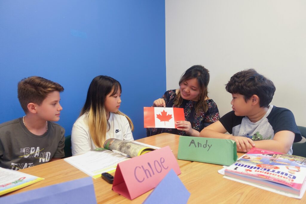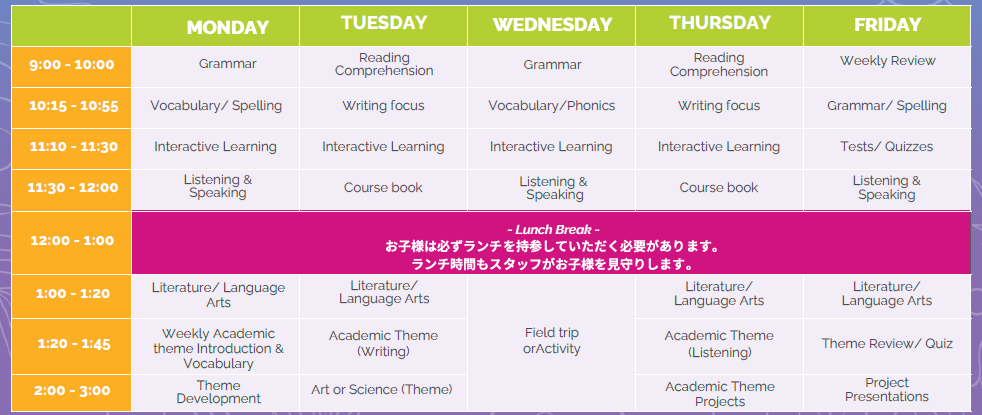 授業は9:00〜15:00のフルタイム英語環境で行われ、カナダの小学校で使われる教材をもとに学習します。